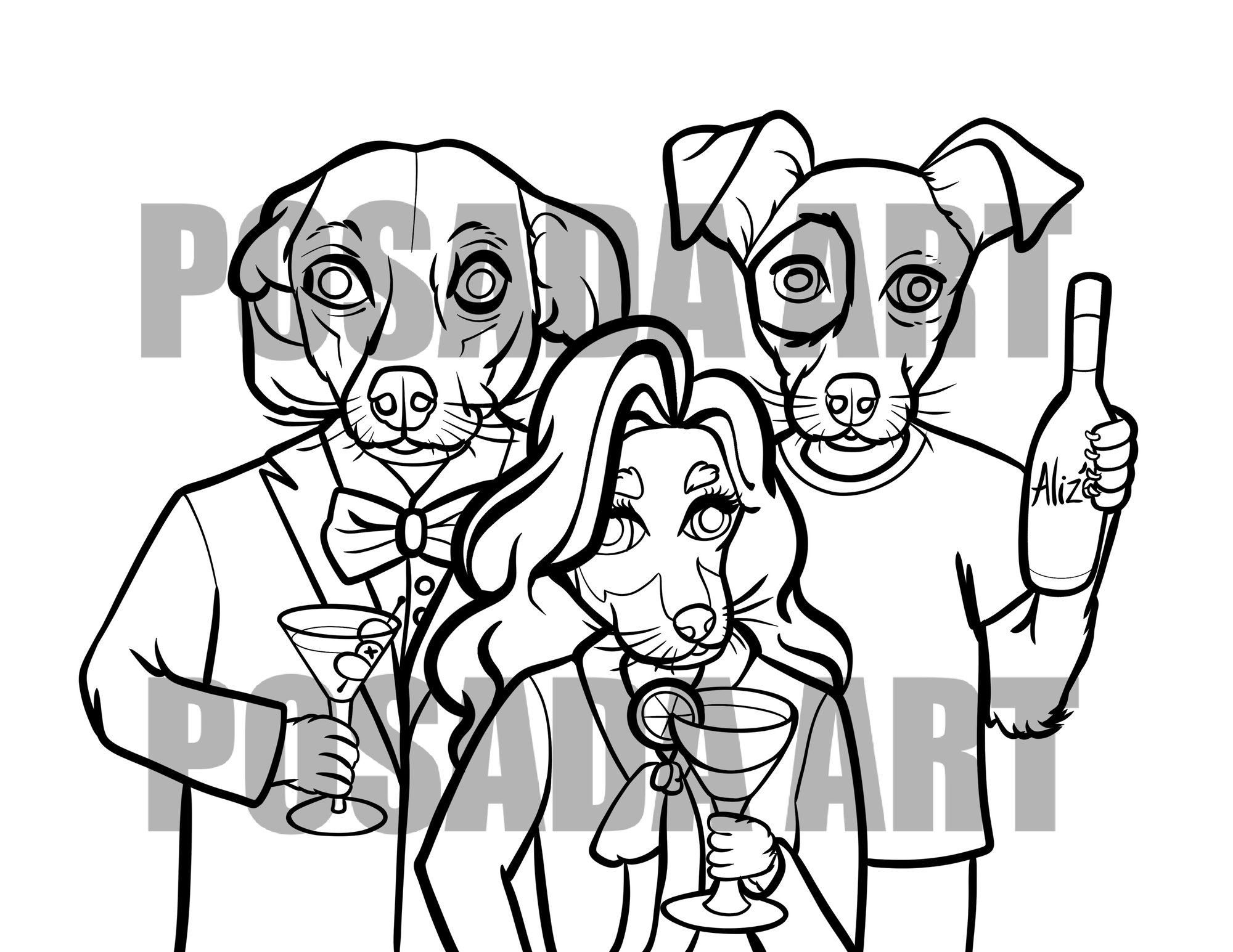 Digital download. Pary animals coloring page, featuring Willy the dachshund and chihuahuas Morrissey and Elvis.
