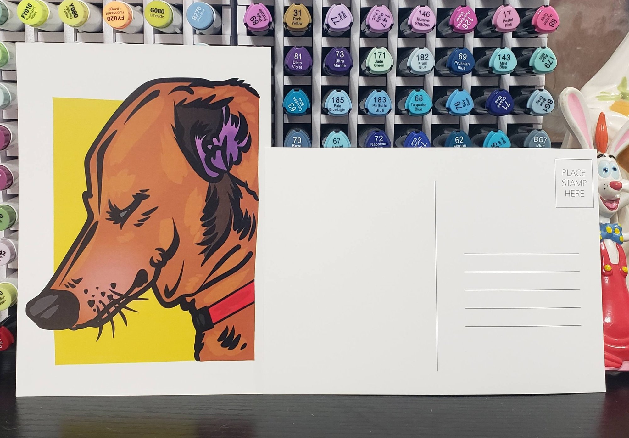 5x7 inch post card featuring digital art of Willy the Dachshund.